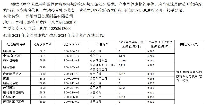 2024年青州恒日金屬制品有限公司危險(xiǎn)廢物污染環(huán)境防治信息公示