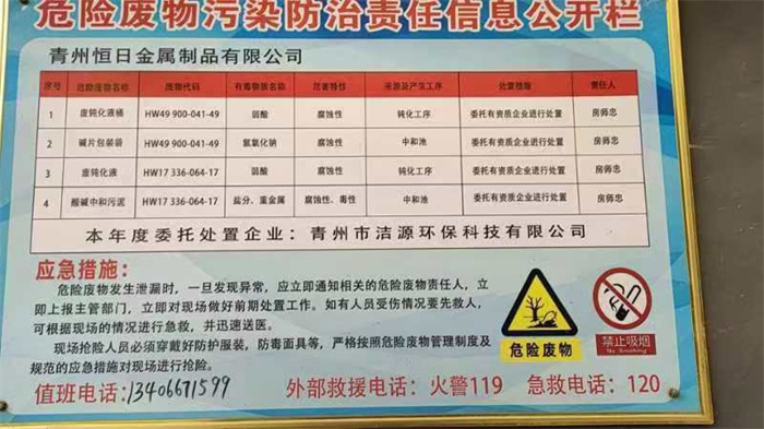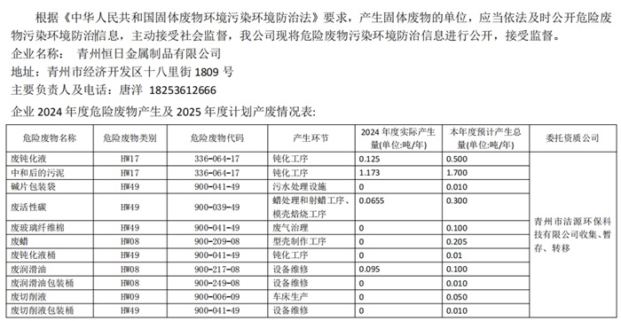 2025年青州恒日金屬制品有限公司危險(xiǎn)廢物污染環(huán)境防治信息公示